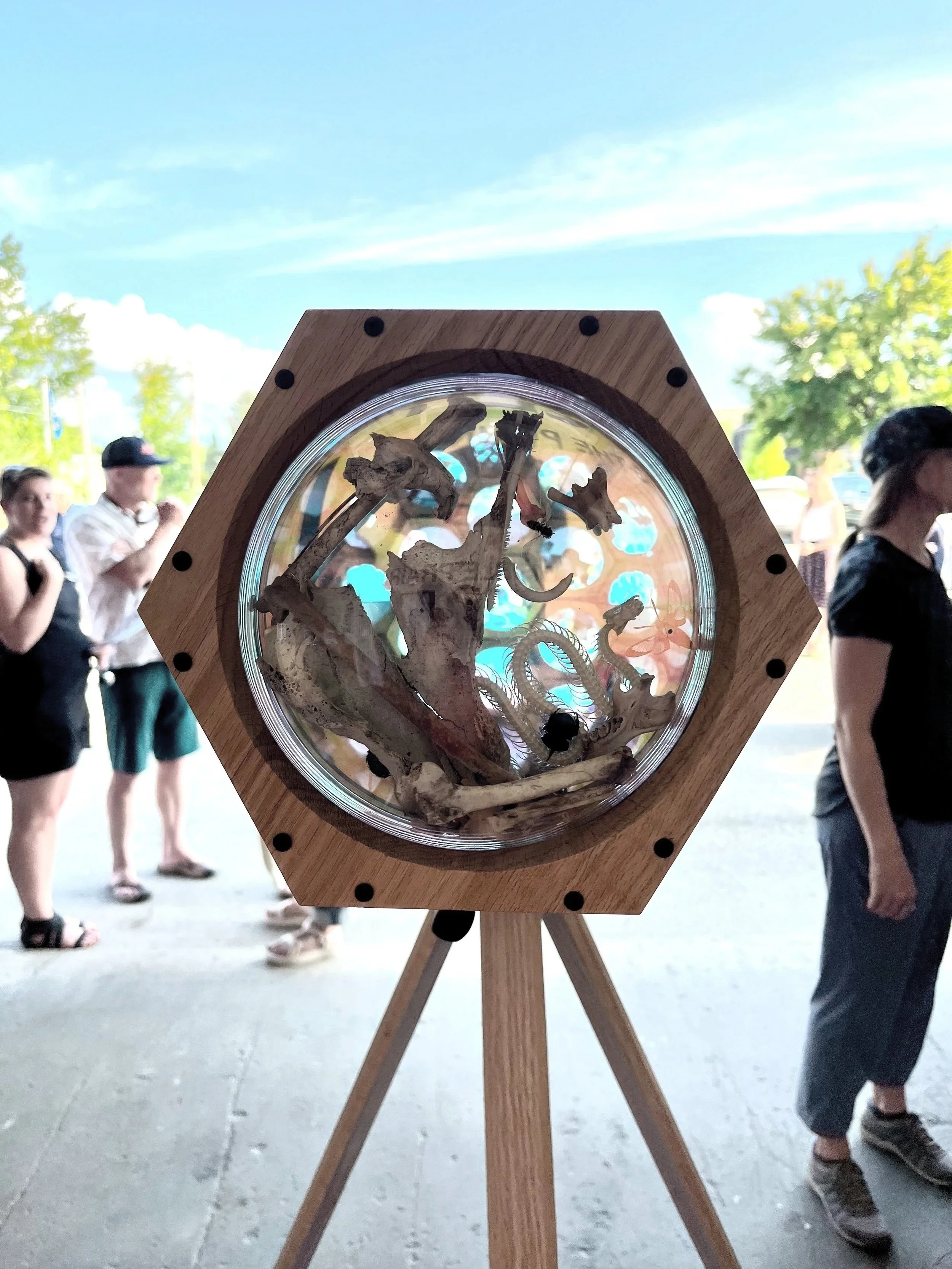 Viewers can gently rotate the eyepiece of this large kaleidoscope. As it turns, insects and bones from mammals, reptiles, fish, and dinosaurs within it reconfigure. They are refracted in mirrors, creating reflections between beautiful and grotesque. They provoke foresight of evolutionary potential or allow one to read their own future in scrying visions.