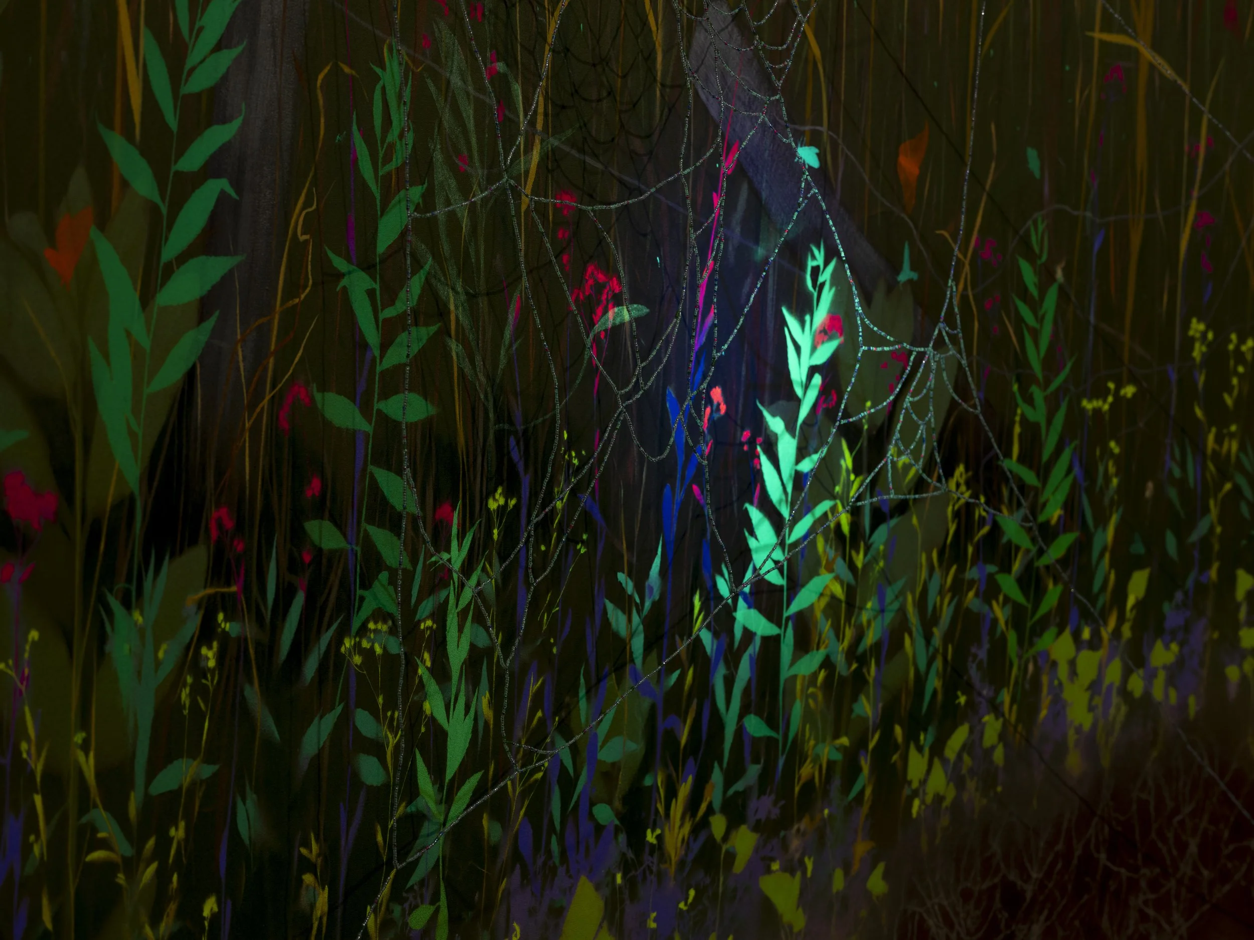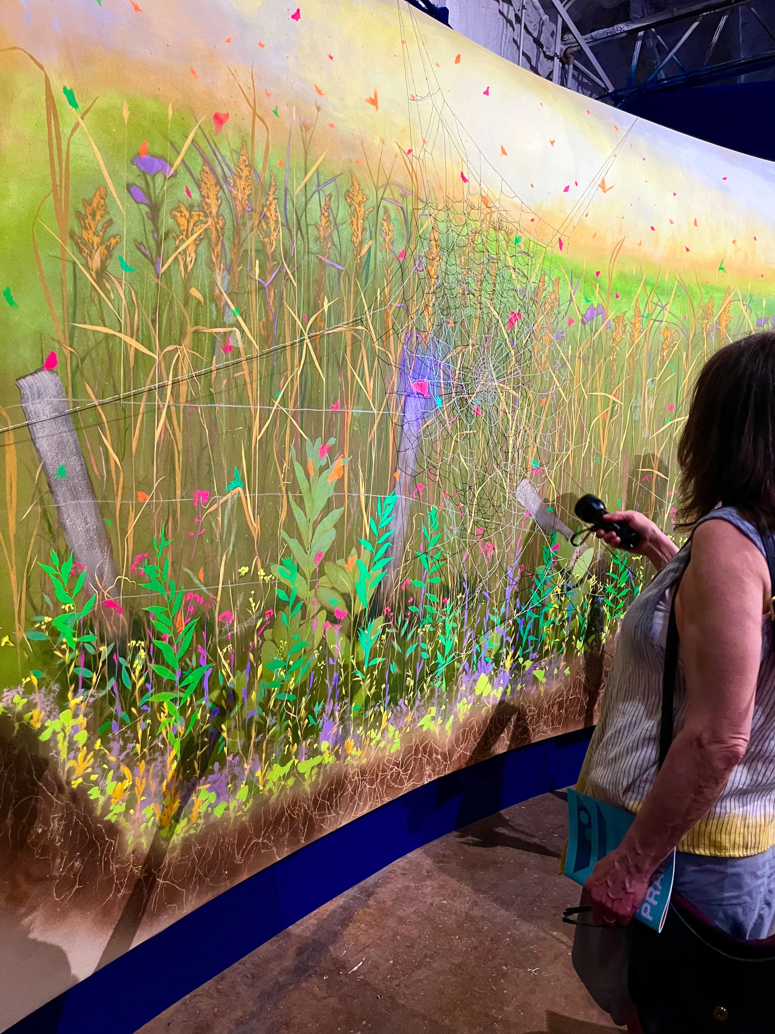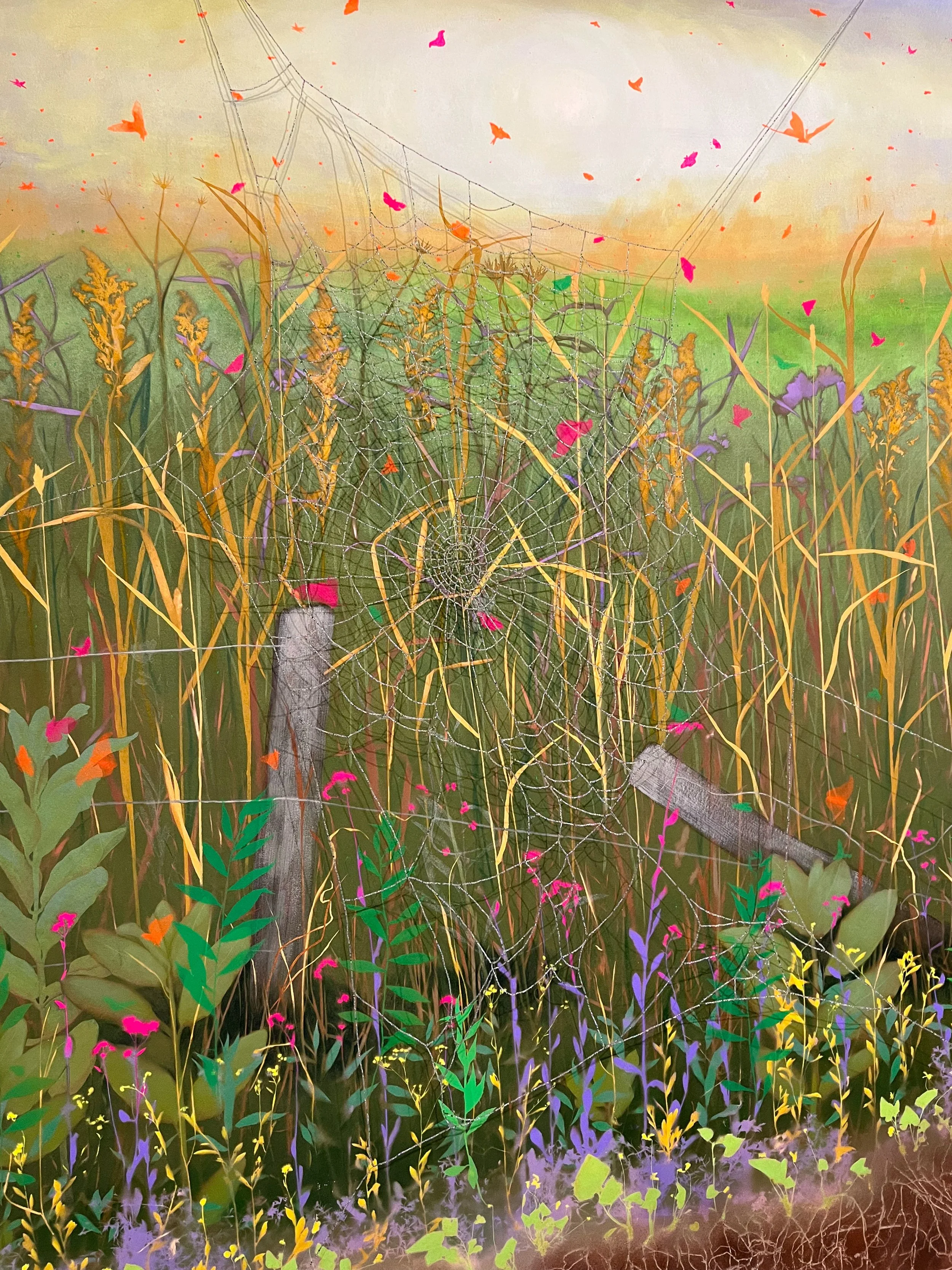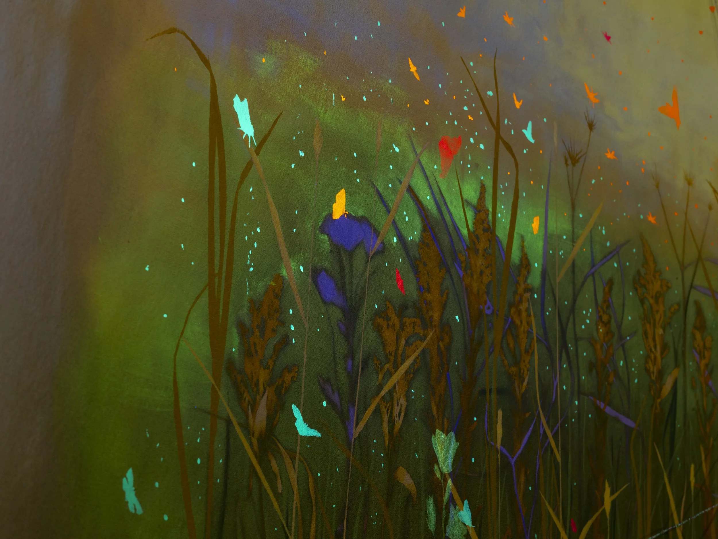 Fallow Field is part of the Afterglow series. Layers of phosphorescent paint flicker as viewers seek-out hidden aspects of this painting with blacklight flashlights- illuminating plants, insects, root systems, and things that exist at the margins of our ability to perceive them because they are invisible, delicate, or small. Made using the silhouettes of pressed grasses and forbs foraged from the Prairie of the American Mid-West, it combines the literal and fantastical in one image. This panoramic landscape immerses the viewer in a vast prairie terrain.