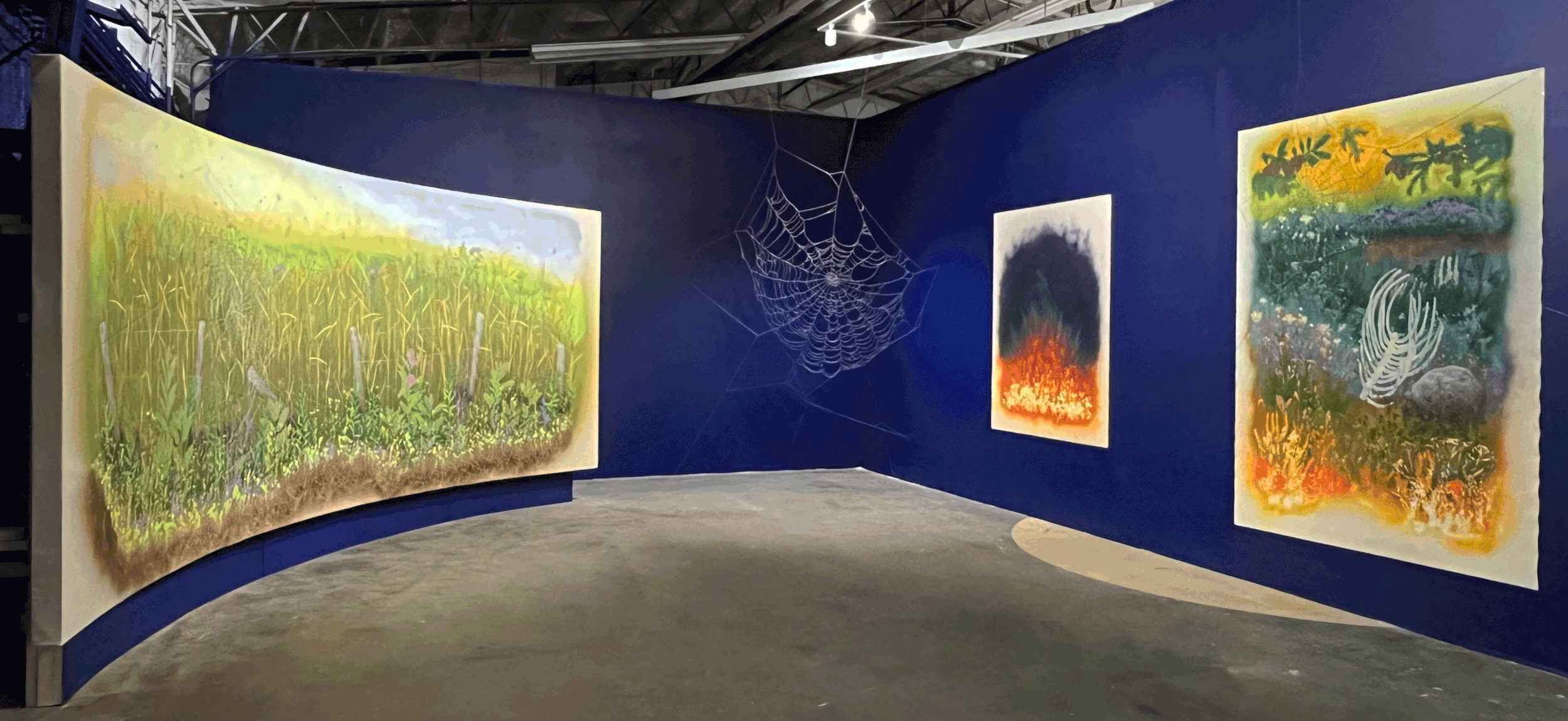 Fallow Field is part of the Afterglow series. Layers of phosphorescent paint flicker as viewers seek-out hidden aspects of this painting with blacklight flashlights- illuminating plants, insects, root systems, and things that exist at the margins of our ability to perceive them because they are invisible, delicate, or small. Made using the silhouettes of pressed grasses and forbs foraged from the Prairie of the American Mid-West, it combines the literal and fantastical in one image. This panoramic landscape immerses the viewer in a vast prairie terrain.