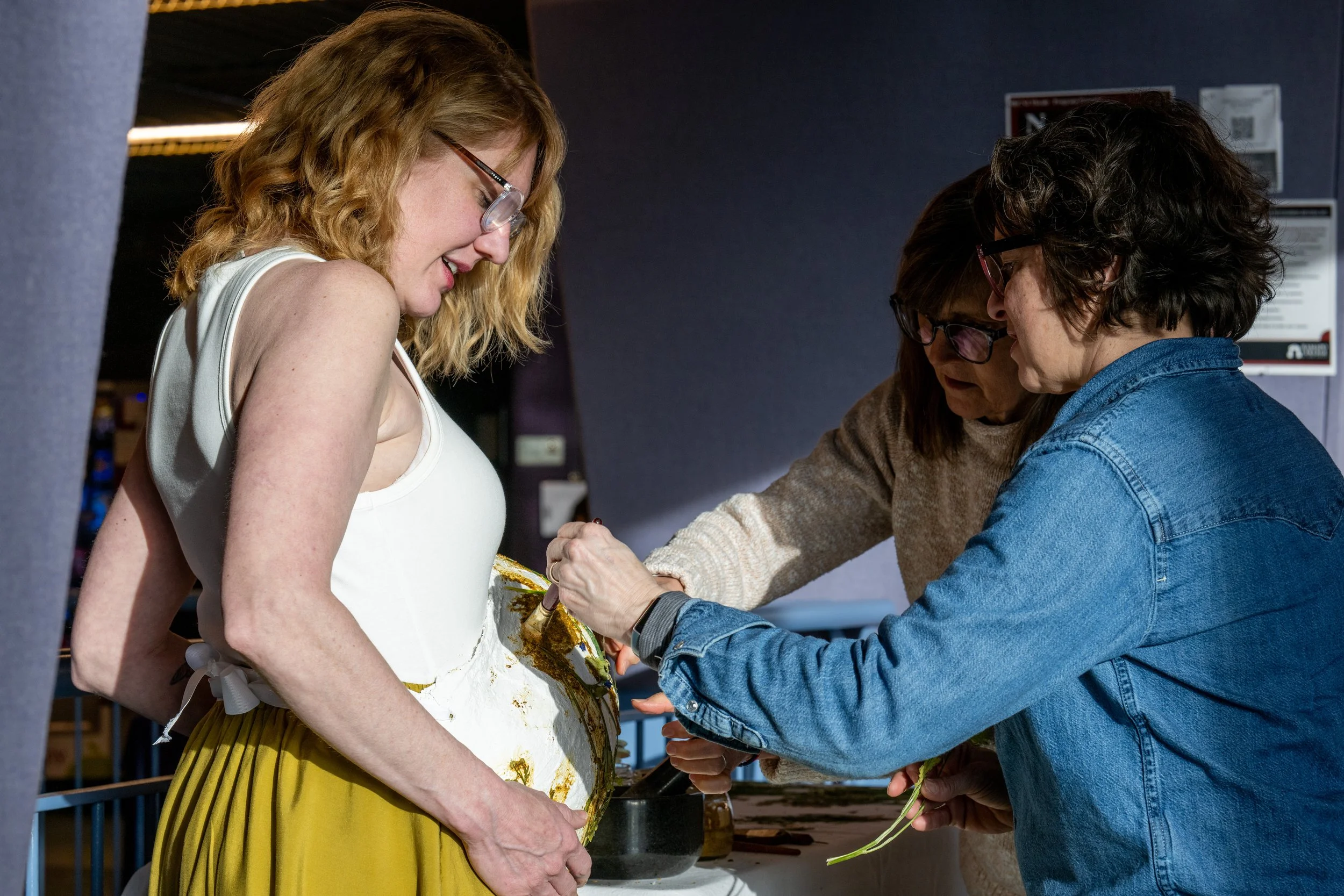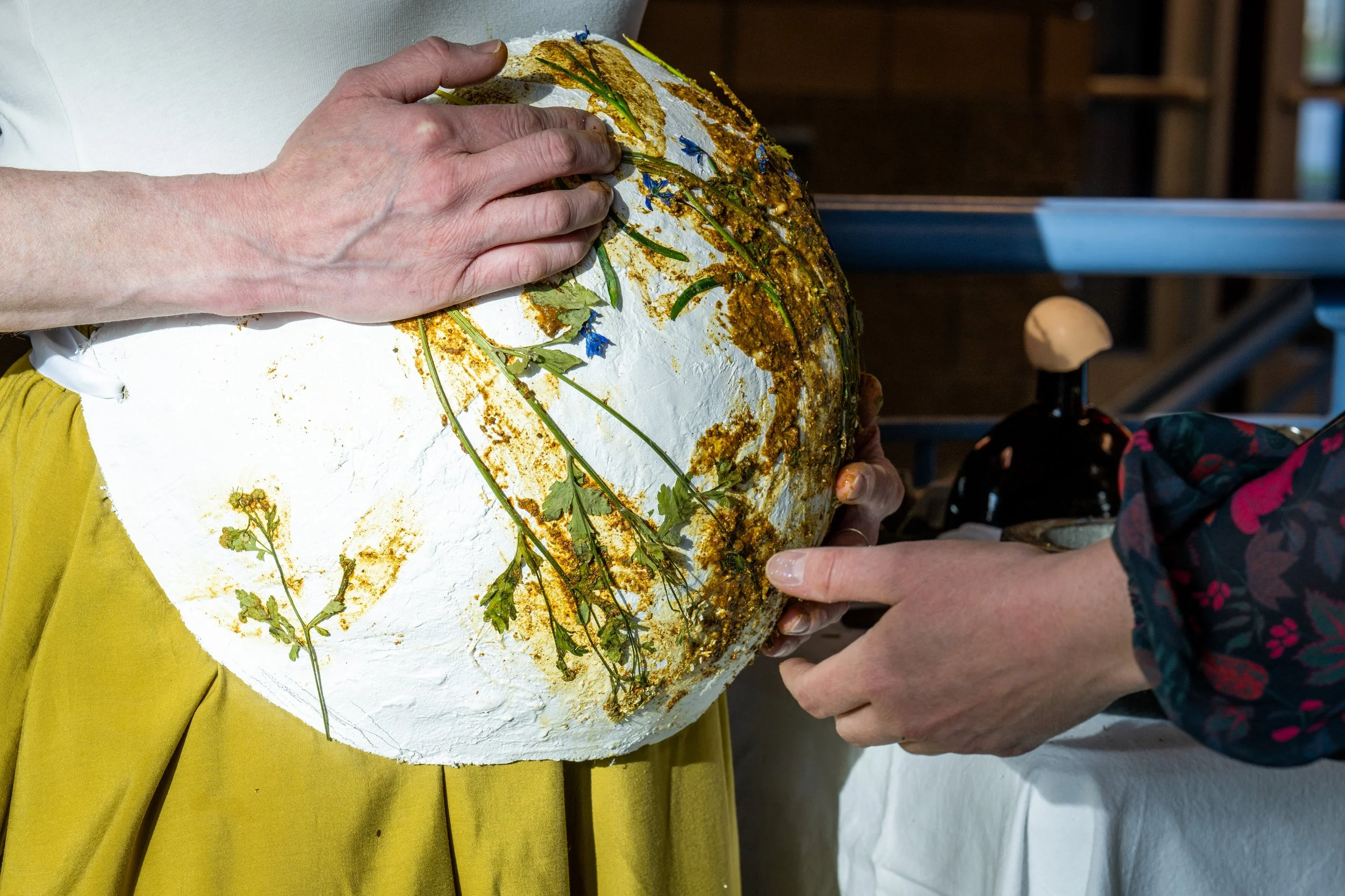 Chamomile flowers and blooms from my garden were painted onto a cast of my pregnant belly in a healing ritual to spark intimate conversations about fertility struggles.